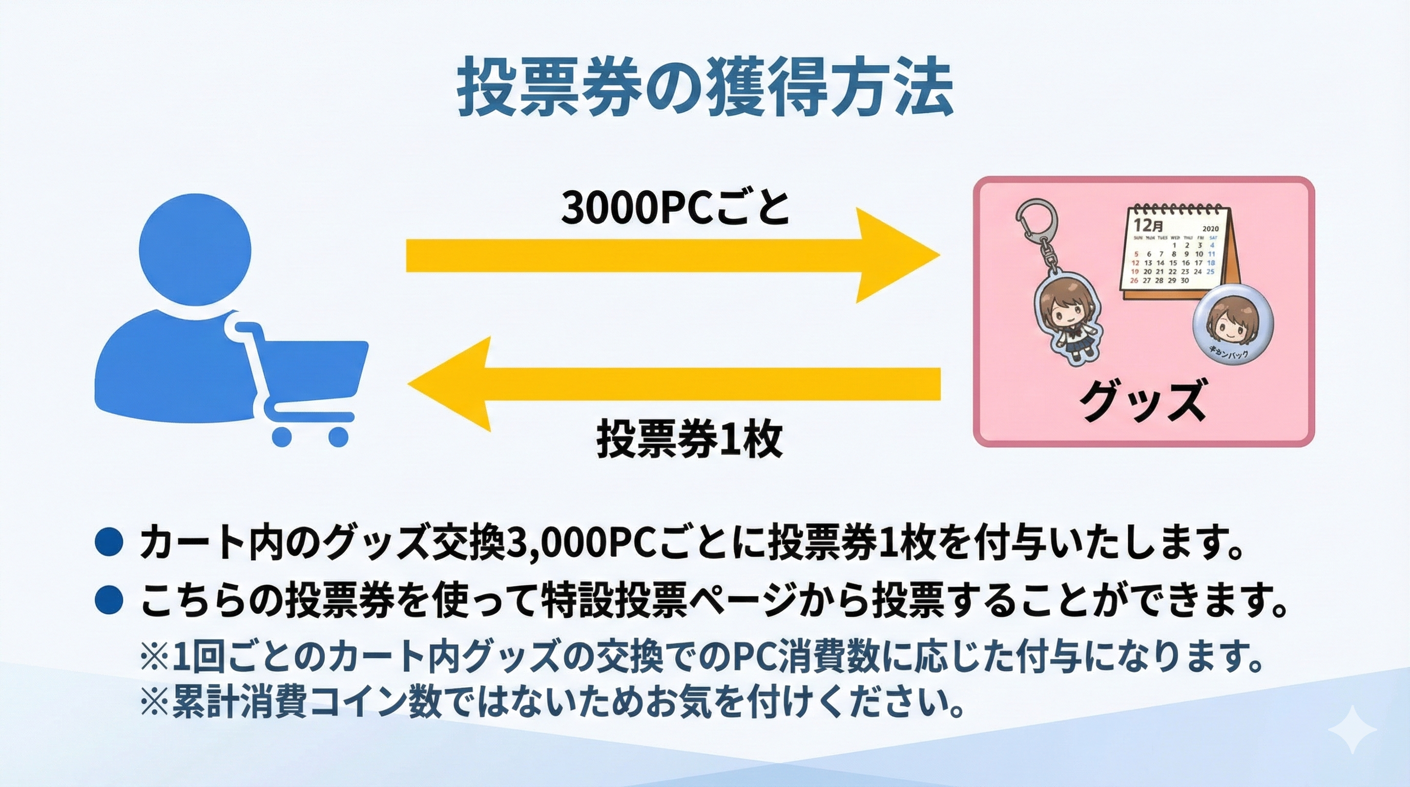 ・グッズ交換 3,000パレデミアコインごとに投票券1枚付与