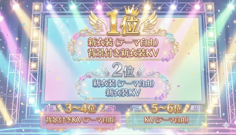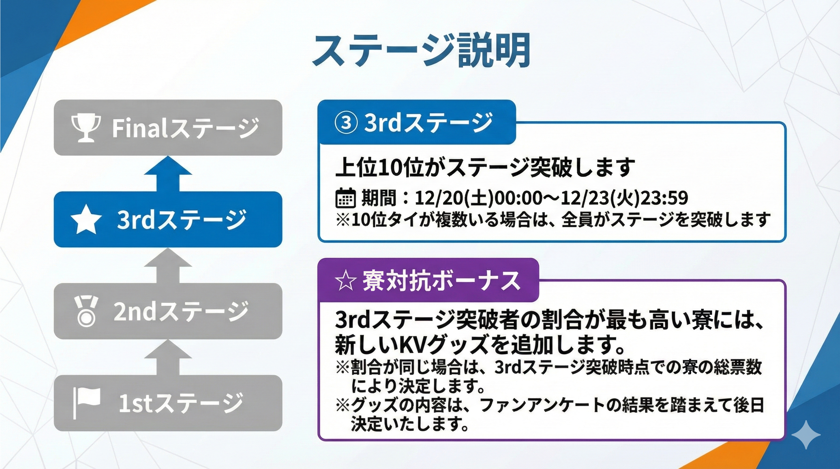 ・寮対抗景品:3rdステージ突破者のうち一番割合の大きい寮は新しいKVグッズを追加します。