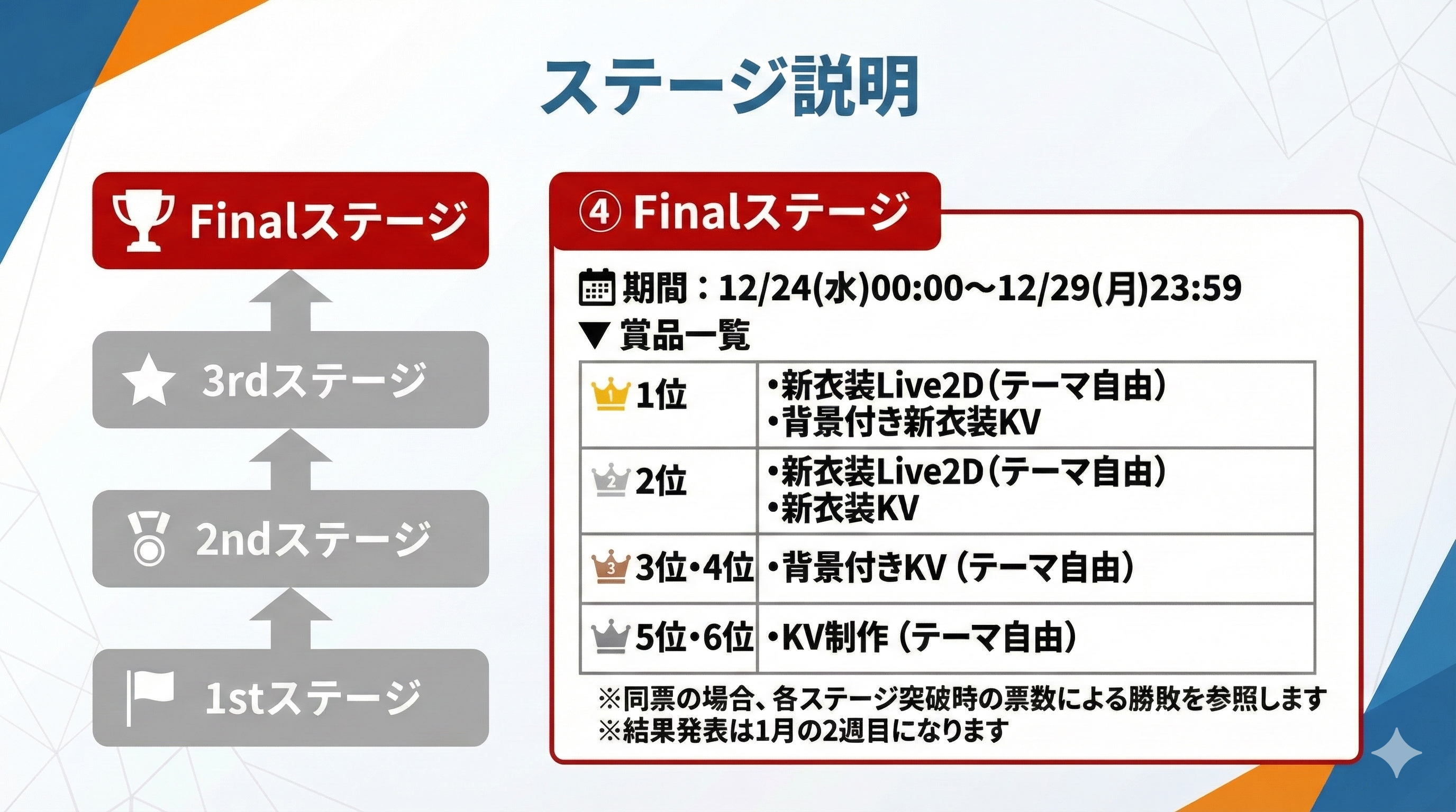 期間中の 総投票数上位6名には、Live2D新衣装などの賞品を獲得します!